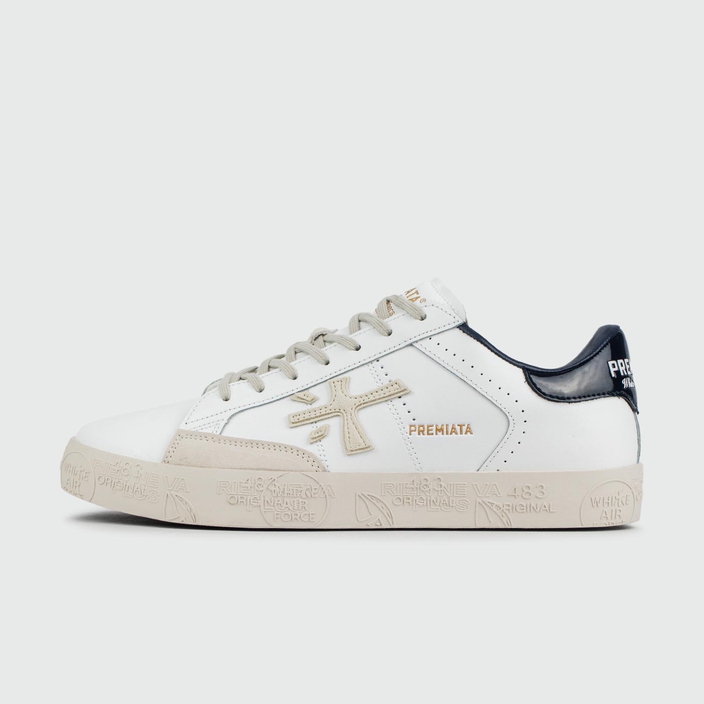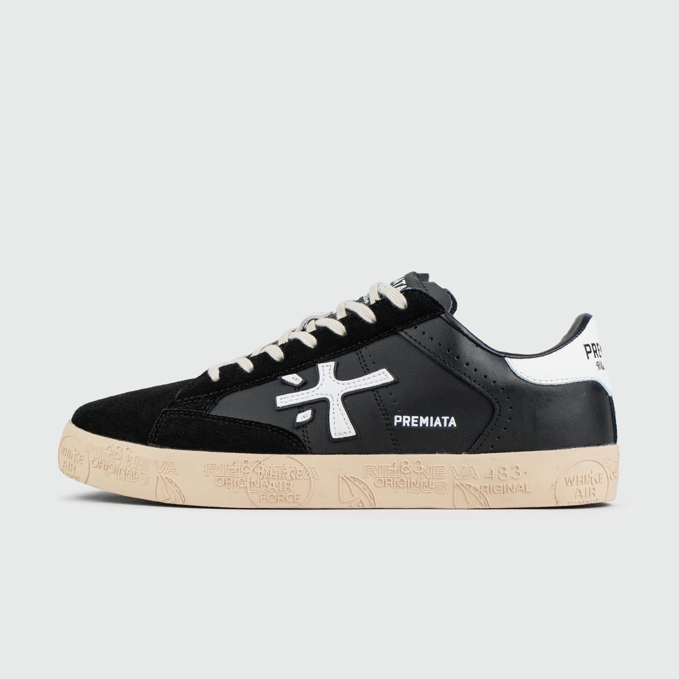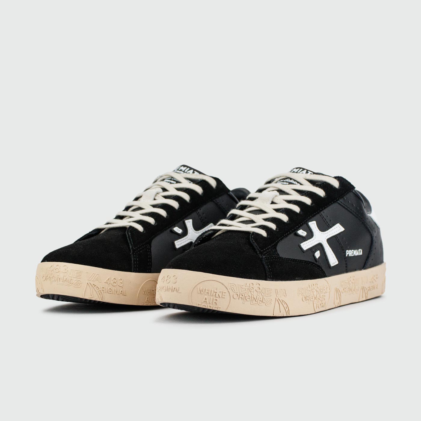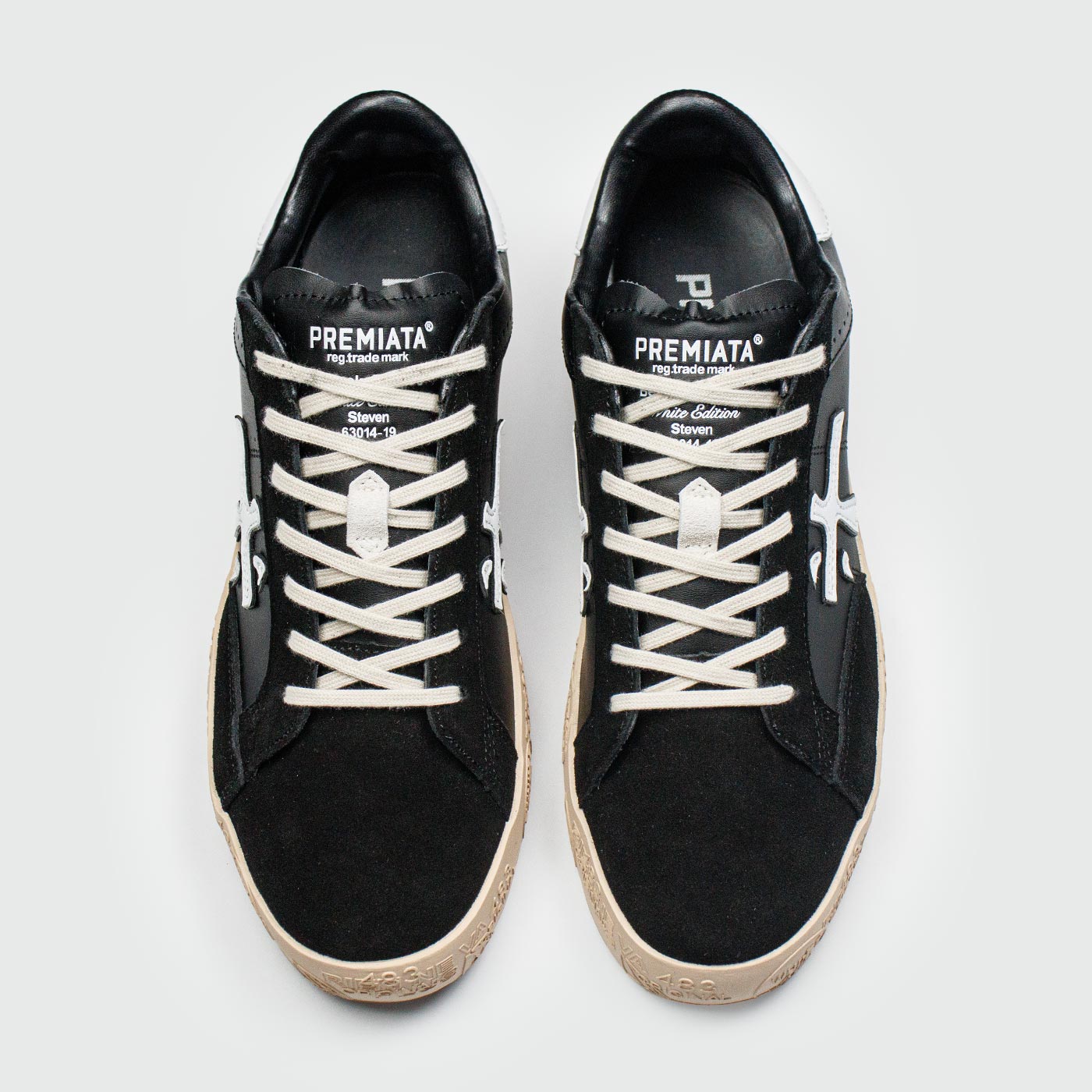 Sneakers from Italian brand Premiata, as evidenced by the logo on the side and stamps on the sole. The pair is made of synthetic leather and has small suede inserts. The white back creates a contrast to the black background.