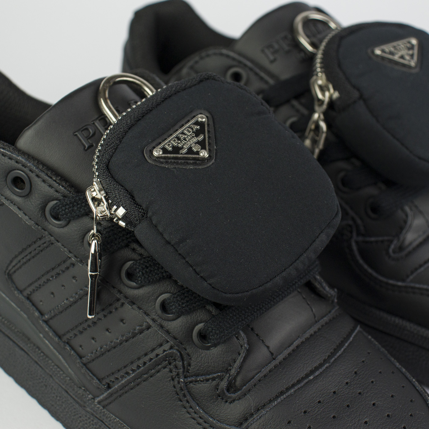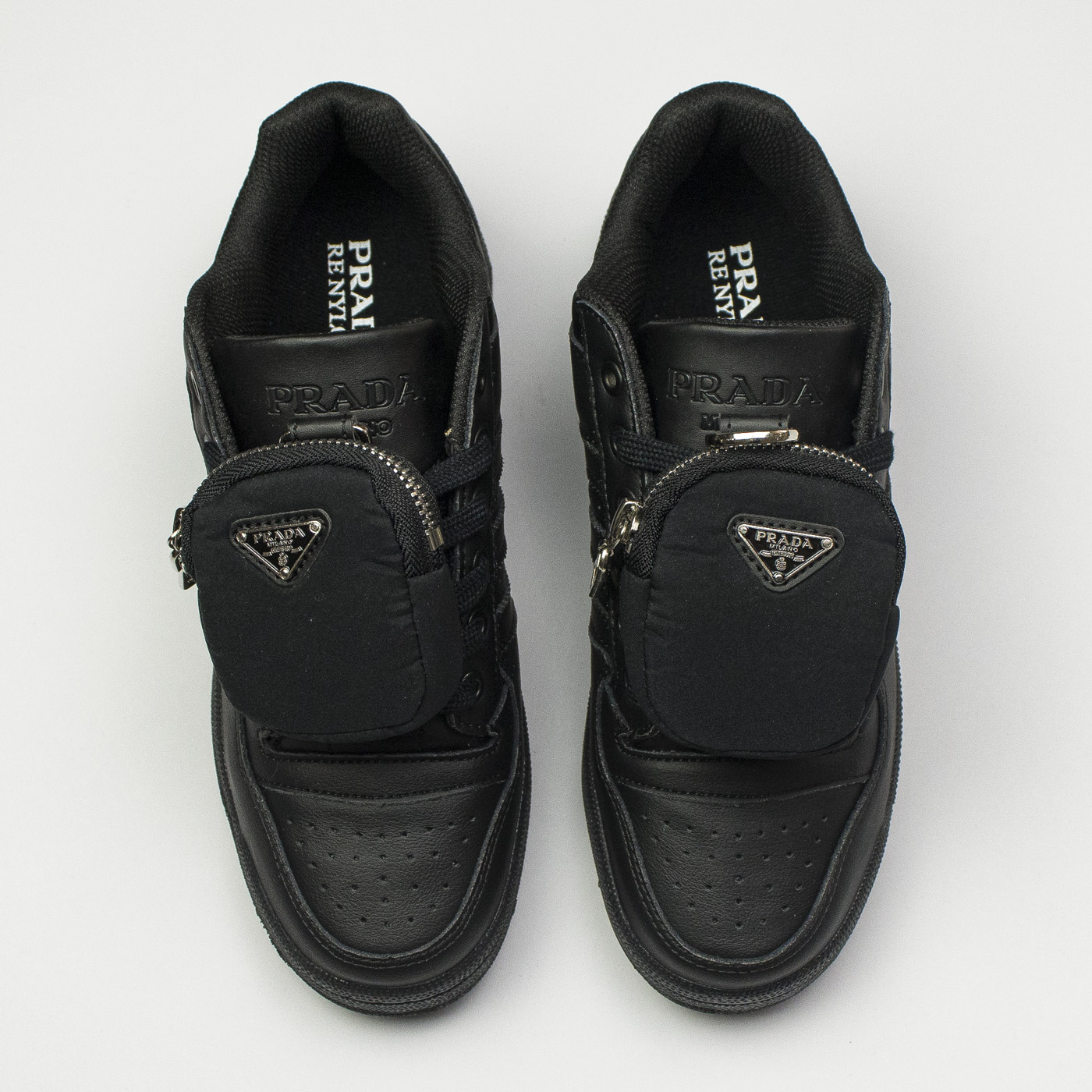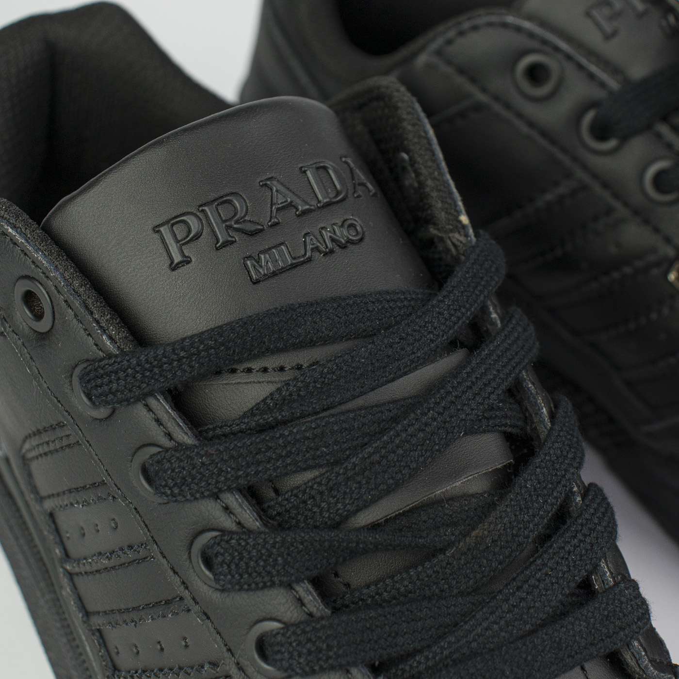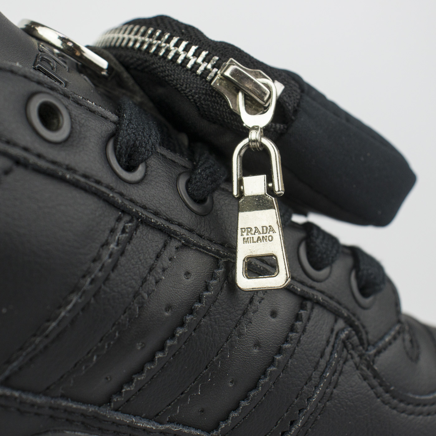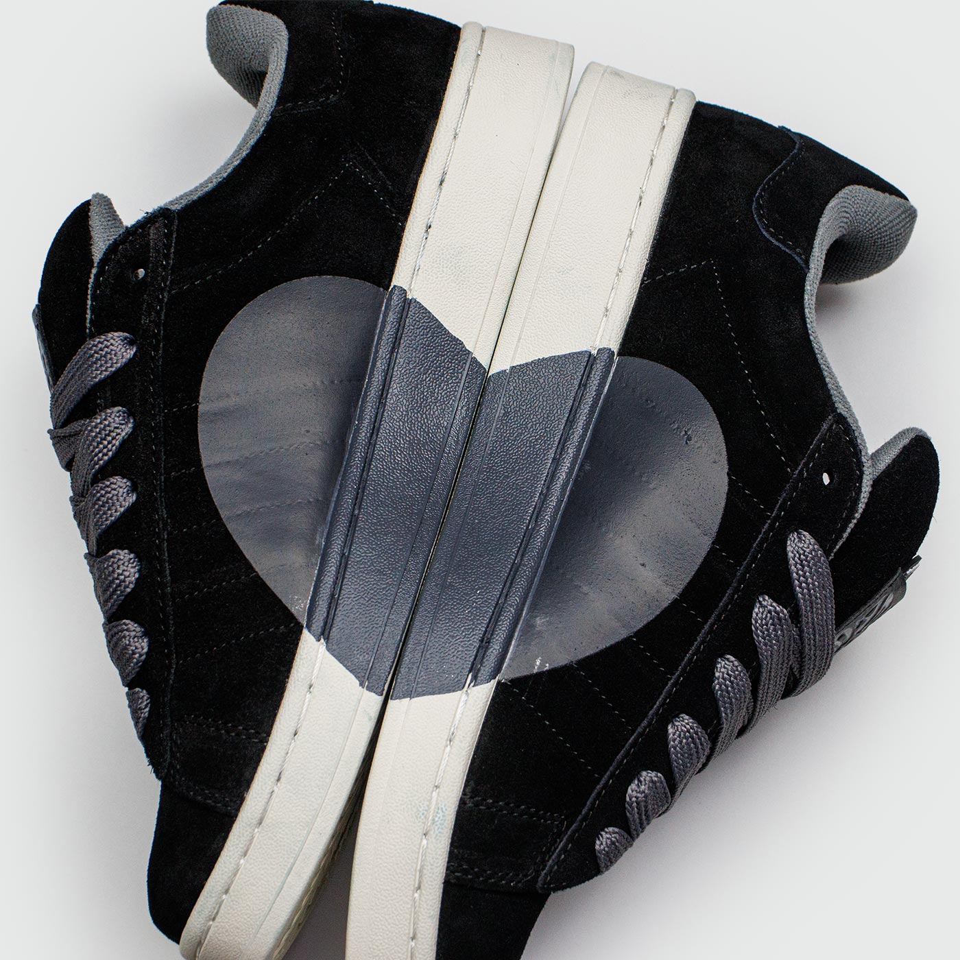 Sneakers from Italian brand Premiata, as evidenced by the logo on the side and stamps on the sole. The pair is made of synthetic leather and has small suede inserts. The white back creates a contrast to the black background.