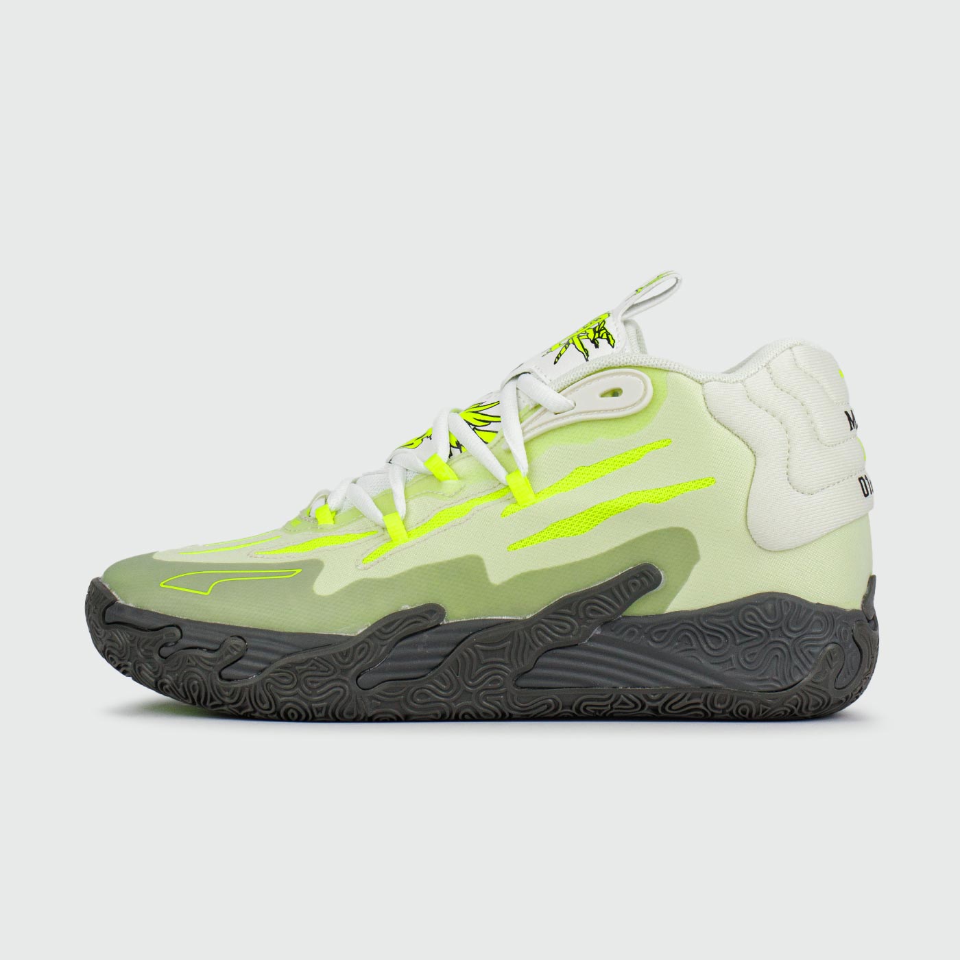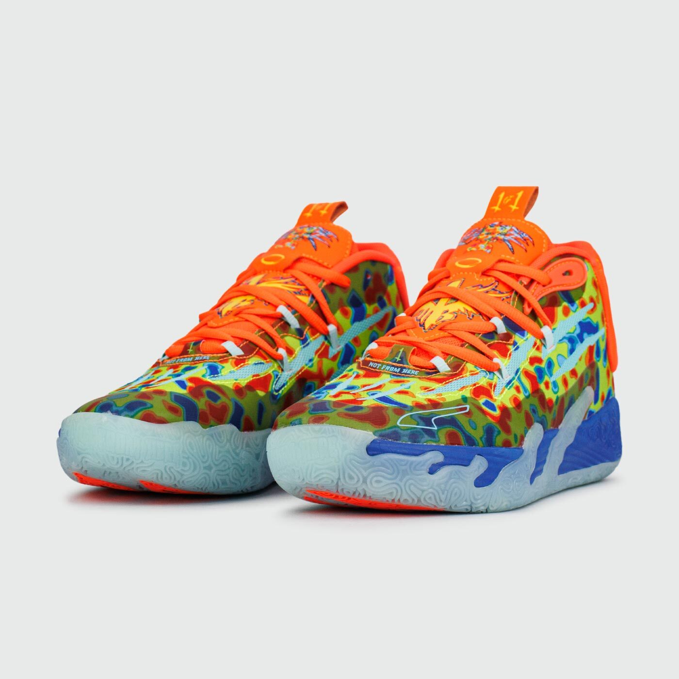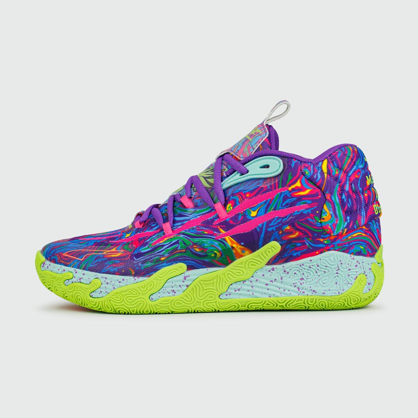 The silhouette of the Puma MB.03 basketball sneaker shares similarities with Lamelo Ball's previous two models, but the design looks bolder and more textured. The upper of the Puma MB.03 is layered.
