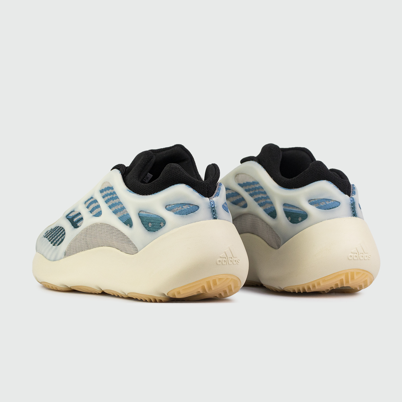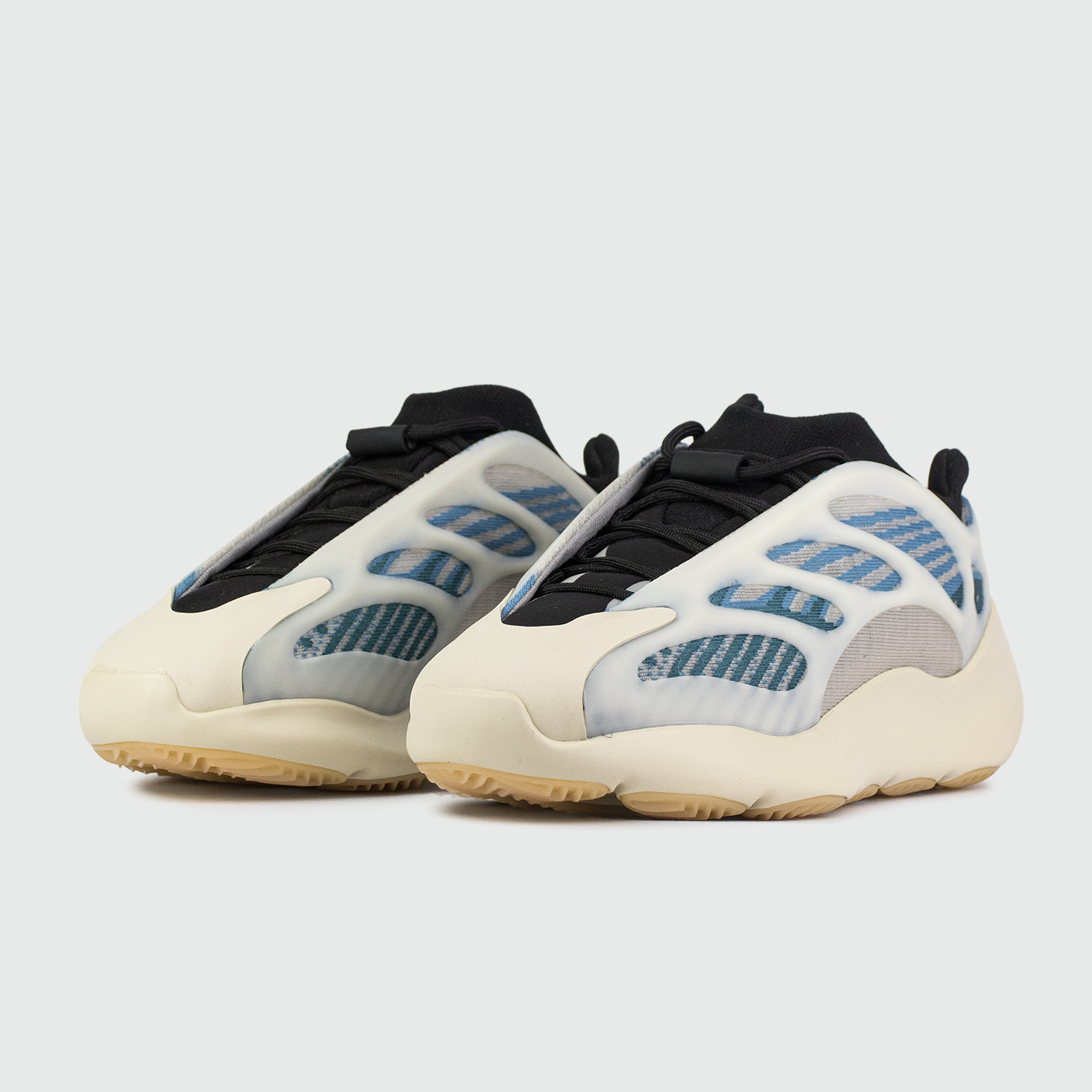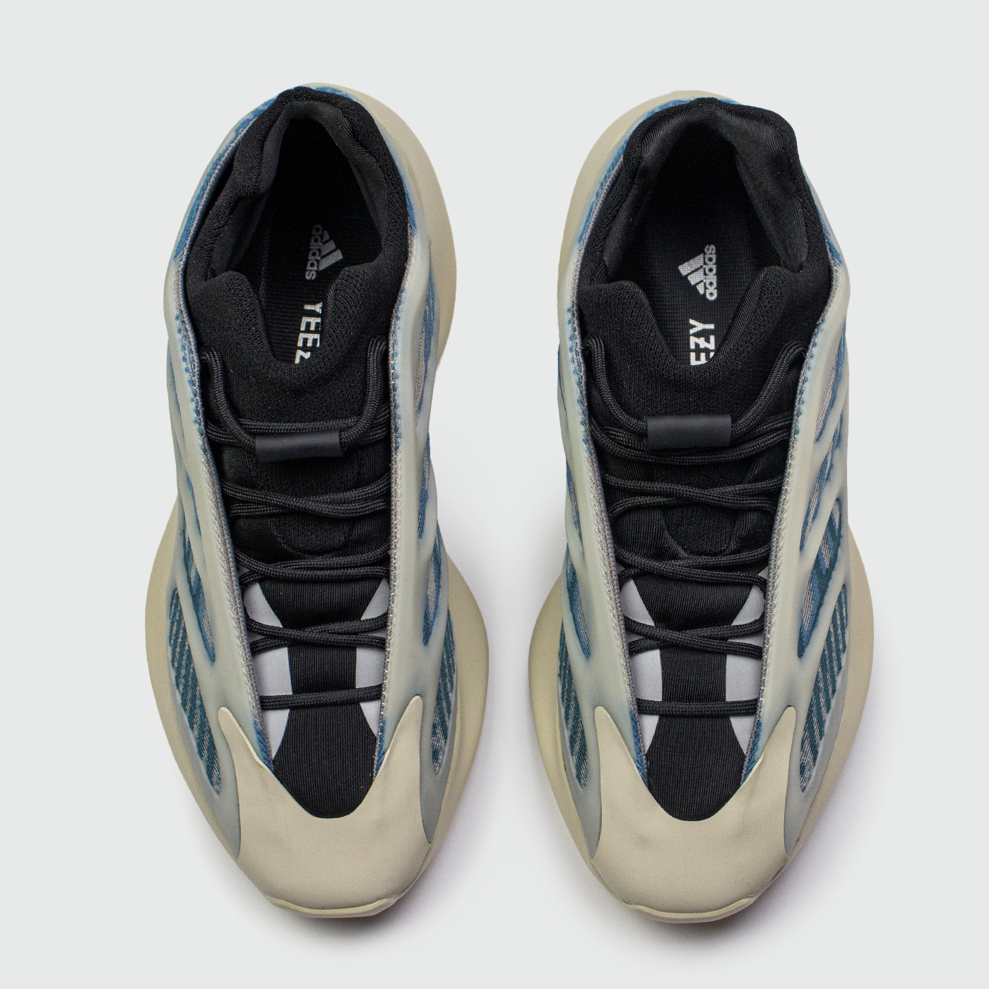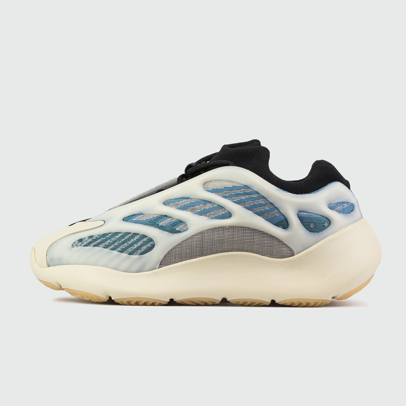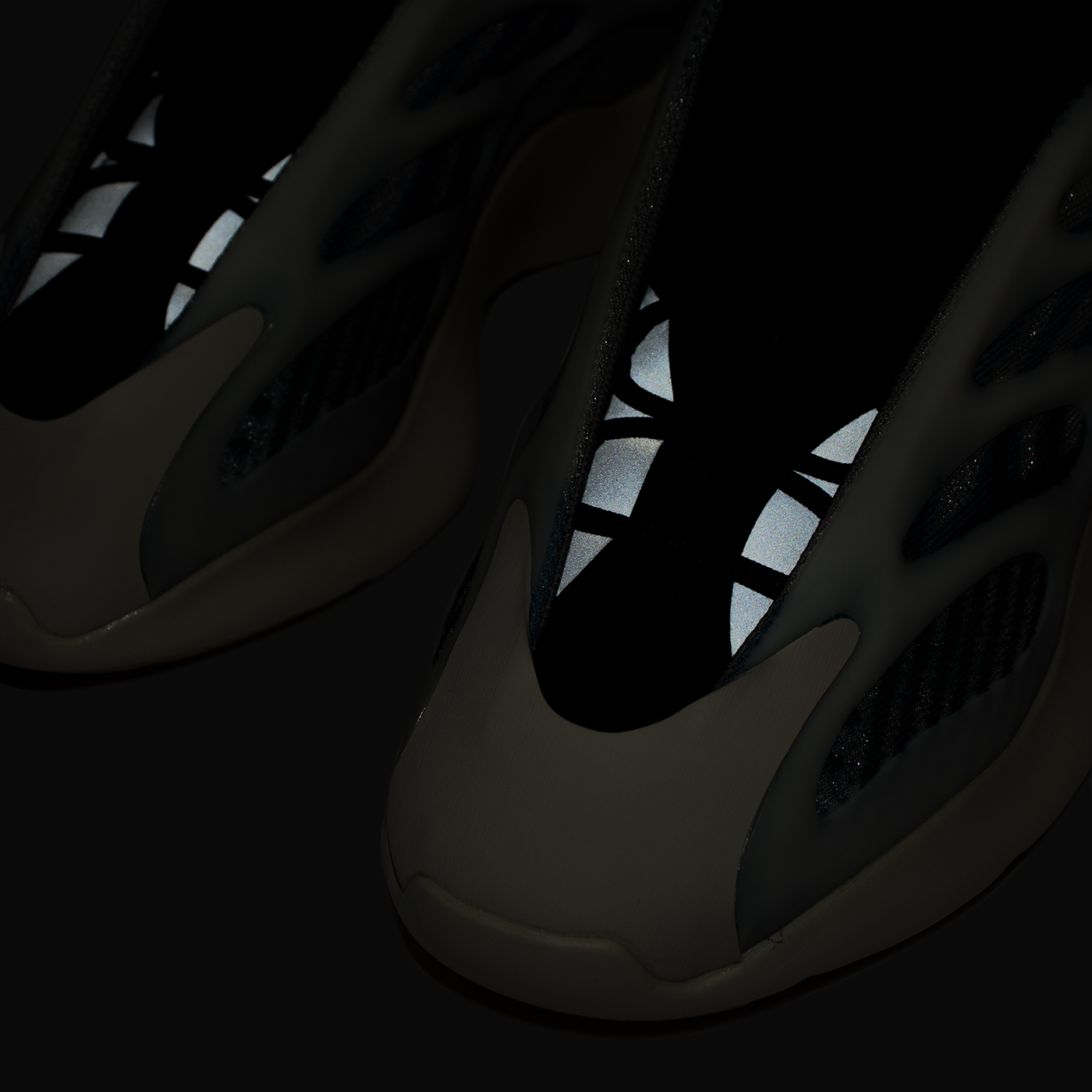 Attention, this model glows in the dark after being in daylight. The upper of the model is made of mesh monofiber and has reflexive overlays made of RPU. The design of the adidas Yeezy Boost 700 V3 has been completely redesigned and created from the designs of the previous versions of the V1 and V2. Instead of being made from a mix of leather and suede, the V3 series sneaker features a mesh textile upper with thick silicone overlays.