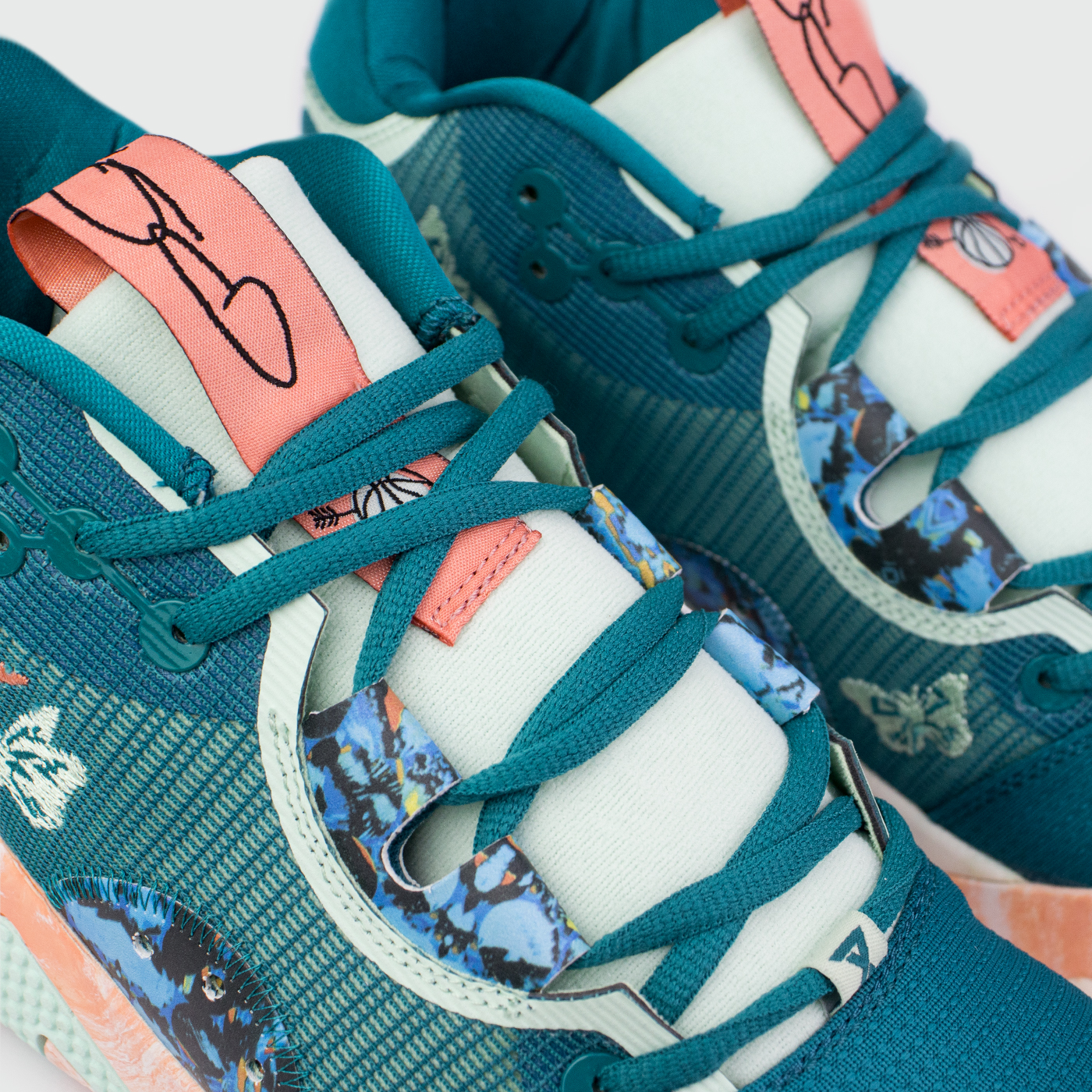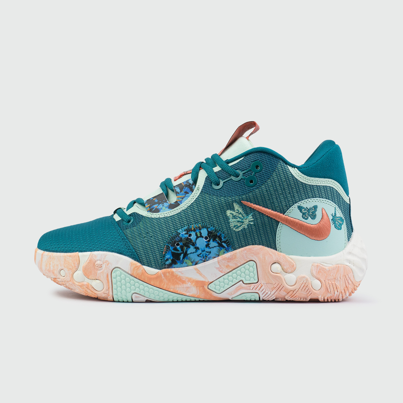 This item comes in branded packaging. This PG 6 version offers a textile combo dark green upper base that contrasts with pink accents, an embroidered “swoosh” on the side and part of the outsole. The pair's “love” theme for February 14 is supported by butterflies and florals, as well as a ball on the tongue with Cupid's arrow.