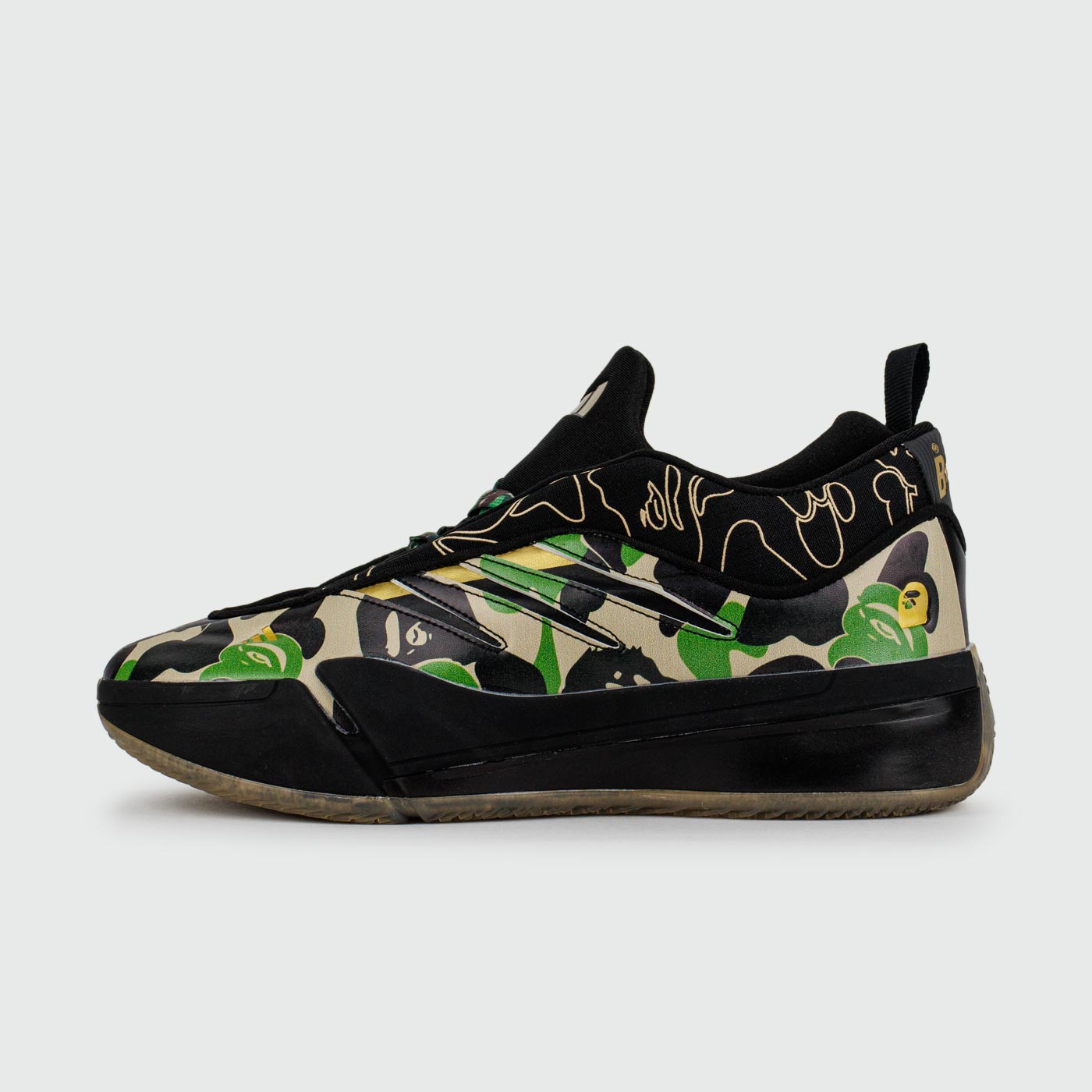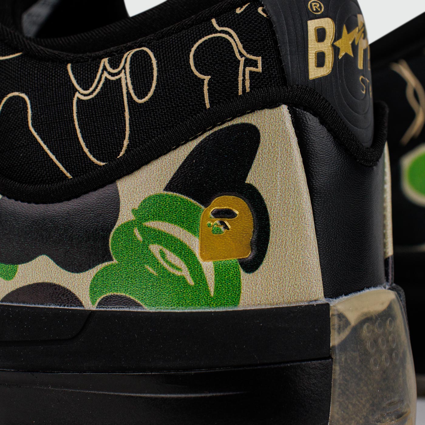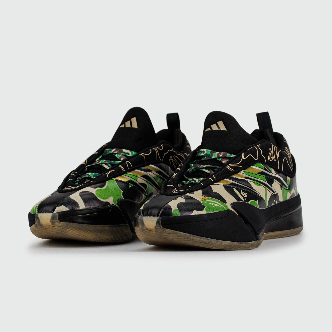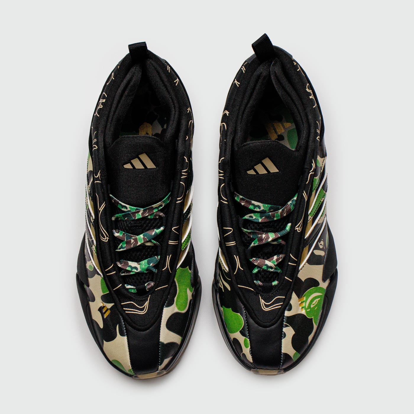 The sneaker showcases a fresh design that combines adidas' cutting-edge basketball technology with the iconic BAPE style. BAPE's signature camouflage print is emblazoned across the entire upper. It is complemented by individual branding elements, including a gorilla logo on the mid heel and the BAPE STA emblem on the rear.